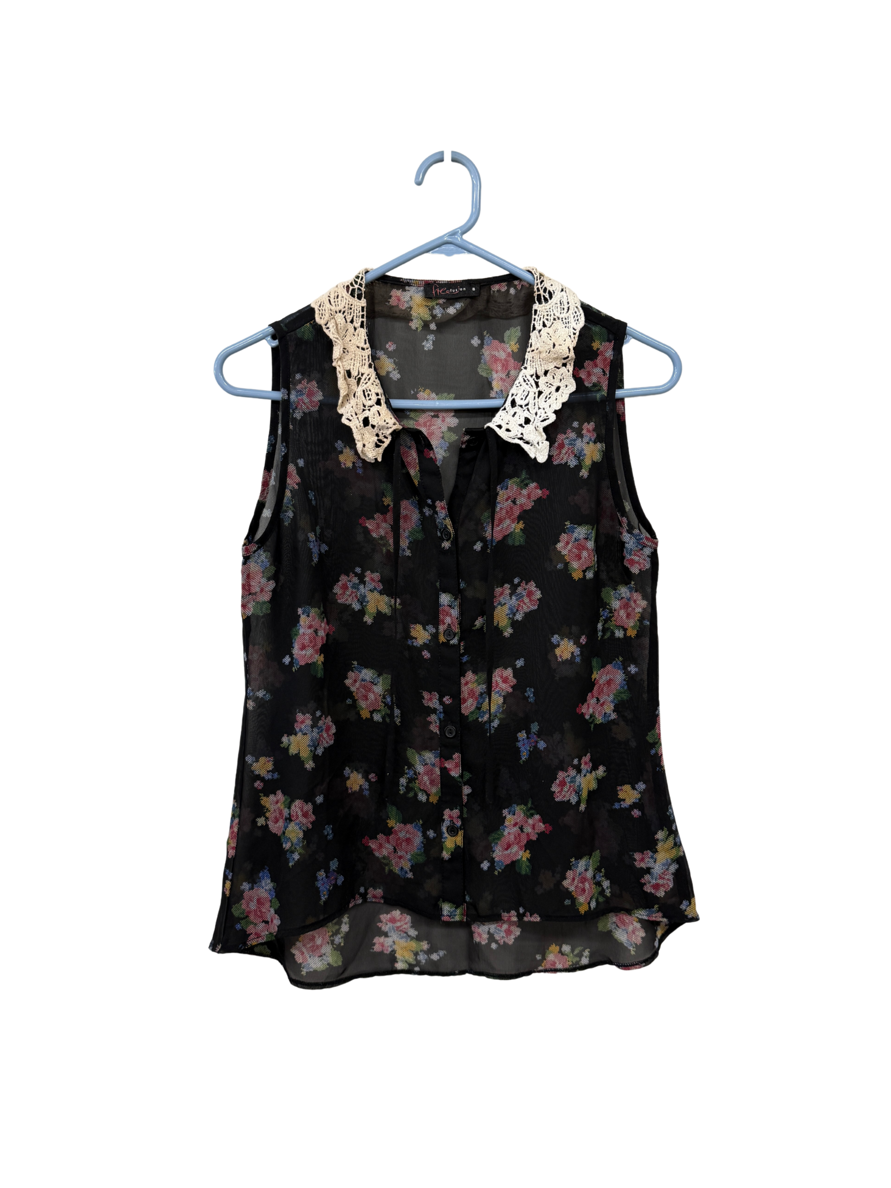 Black & Multicolour Floral Sheer Tank with Crochet Collar